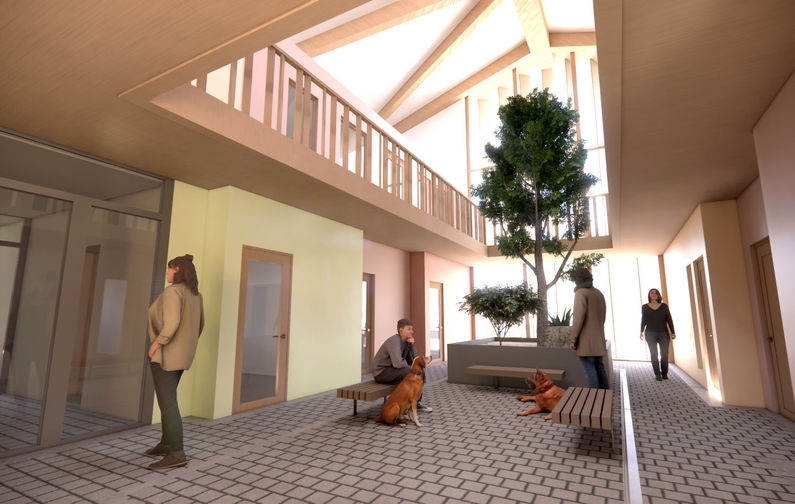 Conçu autour d'une rue intérieure, éclairée zénitalement, le bâtiment reprend volaontairement les codes de la maison, affirmant sa toiture à deux pans.